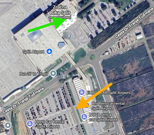 Around €50 is typical with authorized airport taxis. Choosing Uber costs about €25–€35, but you’ll need to walk a short distance from the arrivals hall (green arrow) to the rental car parking area (orange arrow).